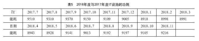 本節(jié)將對項目改造前后近兩年相同月份的空調能耗進行對比分析。我們設定上海地區(qū)每年的天氣都一樣,由此,比較了2018年度與2017年度同期的空調能耗,得出表4所示的數據。我們用2018年度的空調能耗減去2017年度的空調能耗,負值則表示2018年度低于2017年度的能耗值,正值則表示高于,表中單位為kWh。與此同時,我們監(jiān)測在此期間IT設施的功耗運行平穩(wěn)(見表5)。