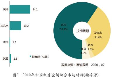 按照制冷冷源不同,機(jī)房空調(diào)可以分為風(fēng)冷型、水冷型和冷凍水型。隨著數(shù)據(jù)中心綠色節(jié)能、高密度、超大規(guī)模的發(fā)展趨勢,特別是大型互聯(lián)網(wǎng)企業(yè)的新建數(shù)據(jù)中心,傳統(tǒng)風(fēng)冷型制冷技術(shù)已經(jīng)無法滿足所需的散熱能力,冷凍水型制冷系統(tǒng)在高效制冷和大制冷量方面的優(yōu)勢,推動了其較快推廣。據(jù)賽迪顧問統(tǒng)計,從市場需求和銷售額來看,風(fēng)冷型制冷仍是目前機(jī)房空調(diào)中的主流機(jī)型,但冷凍水型制冷呈現(xiàn)較快增長趨勢。2019年,風(fēng)冷型機(jī)房空調(diào)市場銷售額達(dá)34.1億元,市場占有率為59.4%;冷凍水型機(jī)房空調(diào)市場銷售額達(dá)19.2億元,市場占有率為33.4%,見圖2。