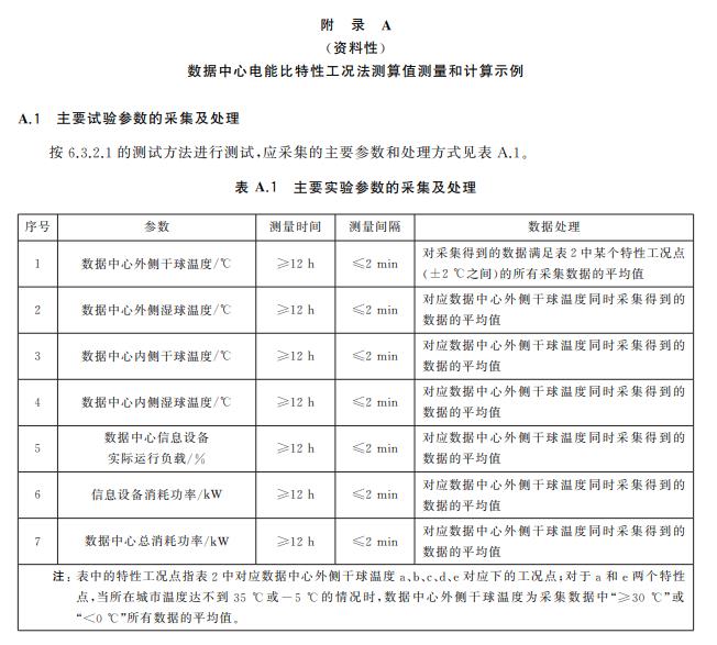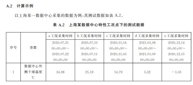 A.3 數(shù)據(jù)中心電能比特性工況法測(cè)算值數(shù)據(jù)記錄要求 在公布數(shù)據(jù)中心電能比特性工況法測(cè)算值時(shí),應(yīng)同時(shí)披露以下信息: ———數(shù)據(jù)中心所在地理位置,精確到城市; ———測(cè)試的具體時(shí)段,以及該時(shí)段內(nèi)所有有效數(shù)據(jù)點(diǎn)對(duì)應(yīng)的數(shù)據(jù)中心內(nèi)外側(cè)干球溫度平均值、濕球 溫度的平均值、信息設(shè)備實(shí)際運(yùn)行負(fù)載平均值、信息設(shè)備消耗功率平均值和數(shù)據(jù)中心總功率平 均值。