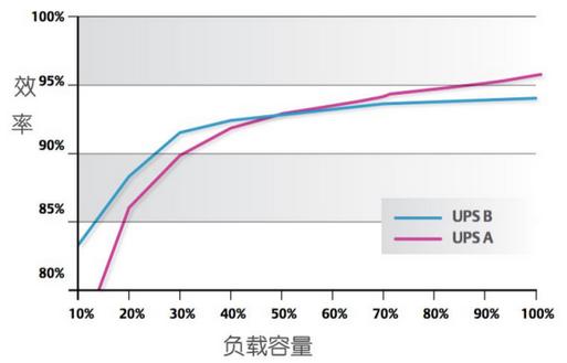 圖1、通過從0到100%的不同容量的效用和IT負(fù)載的測量分別得出的兩款不同的UPS系統(tǒng)的效率曲線之間的差異。