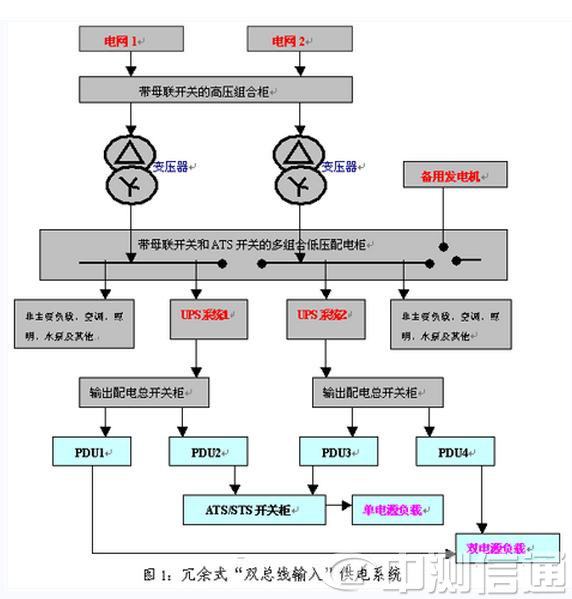 全集中模式下,計(jì)算機(jī)系統(tǒng)是由計(jì)算機(jī)及網(wǎng)絡(luò)等電子設(shè)備組成,這些電子設(shè)備對(duì)電源系統(tǒng)有著嚴(yán)格的技術(shù)標(biāo)準(zhǔn)和要求。UPS供電系統(tǒng),通常是指UPS主機(jī)、蓄電池、靜態(tài)旁路開(kāi)關(guān)及其他接入接出輔助設(shè)備和環(huán)節(jié)組成,要讓網(wǎng)絡(luò)數(shù)據(jù)中心機(jī)房真正具備365×24h連續(xù)不斷運(yùn)行,僅靠工作效率高、輸出能力強(qiáng)的UPS本身無(wú)法達(dá)到,UPS系統(tǒng)中的輸入輸出配電柜、并機(jī)柜、斷路器開(kāi)關(guān)和傳輸電纜等輔助設(shè)備都是單點(diǎn)故障瓶頸,一旦出現(xiàn)問(wèn)題,就必然造成系統(tǒng)停電故障,因此要實(shí)現(xiàn)接近零故障的供電,必須是一個(gè)有高度容錯(cuò)功能的冗余供電系統(tǒng),F(xiàn)代IDC機(jī)房供電系統(tǒng)的硬件配置示意如圖1所示。一般是由2路/多路市電源組成冗余式市電系統(tǒng)+備用發(fā)電機(jī)組+1臺(tái)/多臺(tái)自動(dòng)切換開(kāi)關(guān)(ATS: Automatic Transfer Switch)+防雷擊抗瞬態(tài)浪涌抑制器和UPS供電系統(tǒng)來(lái)共同組成。這基本上是一個(gè)“永遠(yuǎn)不會(huì)停電”的配電系統(tǒng),允許執(zhí)行“不停電”的維護(hù)和檢修操作,可將其可用性提高到99.999%,每年網(wǎng)絡(luò)機(jī)房停機(jī)時(shí)間低于5.26分鐘。