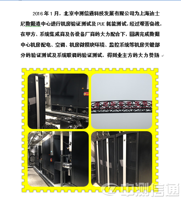 2015年8月,北京中測(cè)信通科技發(fā)展有限公司為上海迪斯尼數(shù)據(jù)中心進(jìn)行機(jī)房驗(yàn)證測(cè)試及PUE耗能測(cè)試,經(jīng)過艱苦奮戰(zhàn),在甲方、系統(tǒng)集成商及各設(shè)備廠商的大力配合下,圓滿完成數(shù)據(jù)中心機(jī)房配電、空調(diào)、機(jī)房微模塊環(huán)境、監(jiān)控系統(tǒng)等機(jī)房關(guān)鍵部分的驗(yàn)證測(cè)試及系統(tǒng)聯(lián)調(diào)的驗(yàn)證測(cè)試,得到業(yè)主方的大力贊揚(yáng).