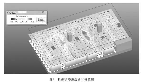 雖然熱通道平均溫度只有25℃,但是部分區(qū)域如D列熱通道會出現熱點,溫度超過35℃左右。而對于低功耗3、4號冷通道,冷量超過需求,機房內冷熱資源分布不均造成浪費。圖1給出了機柜頂部溫度圖3D模擬圖。