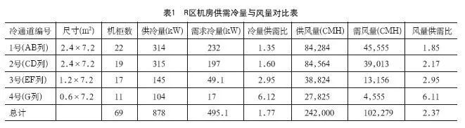 通過將地板出風口處的風速參數輸入到CFD軟件中,模擬出冷通道內風量供需比分布圖。改造前的能耗較大的2個冷通道(1號和2號冷通道),風量供應較低;而對于低功耗的3號和4號冷通道,風量供應較大。R區(qū)機房10臺空調全開的額定最大送風風量為242,000CMH,實際模擬和分析所需風量僅為102,279CMH,供應風量遠大于實際所需風量。