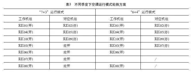 通過理論模擬與實際測量發(fā)現:RK01與RK02,RK04與RK05,RK09與RK10可以形成互補工作機組,機組可以輪換工作;RK03、RK06、RK07、RK08無互補機組,實行24小時工作模式,制定了以周為單位進行輪換的機制。若四臺無互補機組的空調遇到檢修,則將其相鄰兩臺空調機組打開。具體如表3所示。