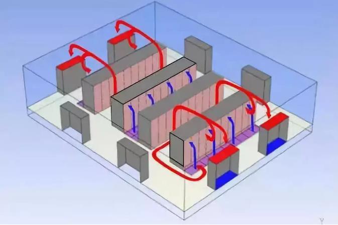 另一方面,考慮在一間矩形的房間內(nèi)放有空調(diào)設(shè)備,活動(dòng)地板以及沒有管道的房間。為了討論的方便,我們假定機(jī)架列的長度都是相同的方向?照{(diào)位于房間冷通道的位置,冷風(fēng)從空調(diào)前端送入冷通道繞過空氣流動(dòng),熱回風(fēng)從熱通道流出。這種空方式多少可以調(diào)整熱通道與冷通道的風(fēng)量,但這種方式,在一定程度上會(huì)呈現(xiàn)出不受控制的回風(fēng)系統(tǒng)。