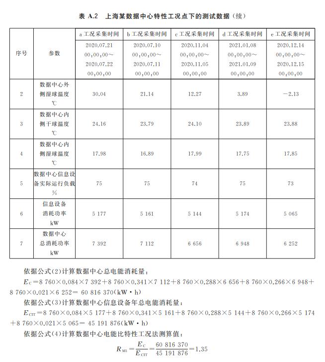 A.3 數(shù)據(jù)中心電能比特性工況法測(cè)算值數(shù)據(jù)記錄要求 在公布數(shù)據(jù)中心電能比特性工況法測(cè)算值時(shí),應(yīng)同時(shí)披露以下信息: ———數(shù)據(jù)中心所在地理位置,精確到城市; ———測(cè)試的具體時(shí)段,以及該時(shí)段內(nèi)所有有效數(shù)據(jù)點(diǎn)對(duì)應(yīng)的數(shù)據(jù)中心內(nèi)外側(cè)干球溫度平均值、濕球 溫度的平均值、信息設(shè)備實(shí)際運(yùn)行負(fù)載平均值、信息設(shè)備消耗功率平均值和數(shù)據(jù)中心總功率平 均值。
