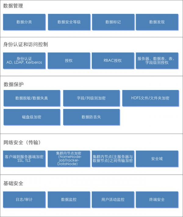 基于以上四層的安全體系,結(jié)合大數(shù)據(jù)平臺的特性,企業(yè)在實(shí)踐大數(shù)據(jù)平臺安全化時(shí),需要有更詳細(xì)的架構(gòu)設(shè)計(jì),四層安全體系對應(yīng)在實(shí)際環(huán)境中,應(yīng)是以數(shù)據(jù)為中心,建立完善的管理制度,先治理好大數(shù)據(jù),再從訪問控制和數(shù)據(jù)保護(hù)層面加強(qiáng)對數(shù)據(jù)使用的安全防護(hù),最后從網(wǎng)絡(luò)和基礎(chǔ)層加固平臺的安全部署。因此,大數(shù)據(jù)安全框架需包含以下5個(gè)核心模塊: 數(shù)據(jù)管理、身份和訪問管理、數(shù)據(jù)保護(hù)、網(wǎng)絡(luò)安全、基礎(chǔ)安全。