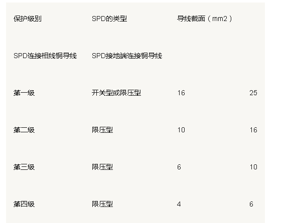 2、一般,將SPD安裝在被保護(hù)設(shè)備以及UPS前端,SPD所有連接導(dǎo)線應(yīng)盡可能短,特別是接地線,其長度不宜大于0.5m。所有連線應(yīng)規(guī)整,平直,線徑應(yīng)符合表4-1的要求