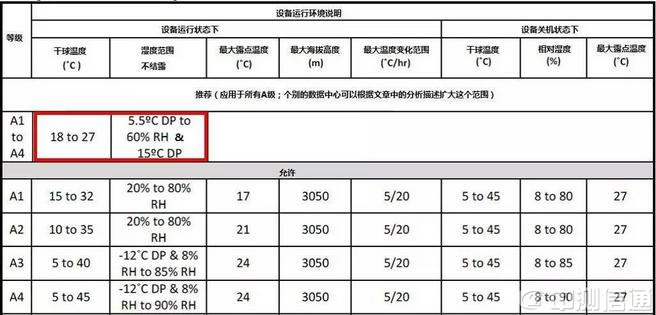 ASHRAE TC 9.9-2011 Thermal Guidelines for Data Processing Environments-Expanded DataCenter Classes and Usage Guidance (2011 數(shù)據(jù)處理環(huán)境散熱指南-延伸到數(shù)據(jù)中心等級(jí)與使用指南)[1]中對(duì)機(jī)房熱環(huán)境的規(guī)定如下(紅色線框內(nèi)表示數(shù)據(jù)中心A1~A4等級(jí)機(jī)房的推薦溫濕度)。